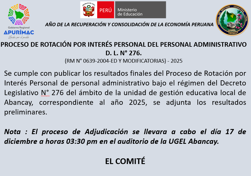 PROCESO DE ROTACIÓN DE PERSONAL ADMINISTRATIVO – D.L. N° 276 RESULTADO PRELIMINAR ROTACION 2025Descarga