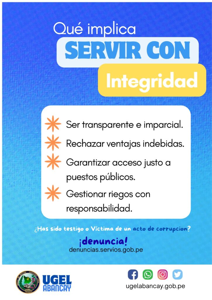 actuando con transparencia, rechazando toda ventaja indebida y garantizando un trato justo para todos. 💙¡Juntos construimos una gestión pública honesta! #Integridad #UGELAbancay