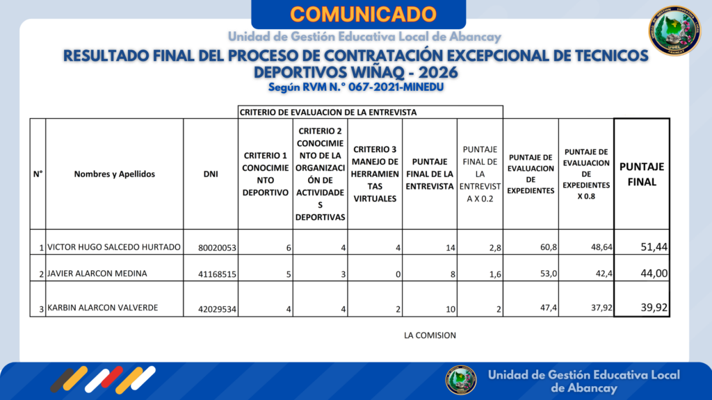 RESULTADOS FINALES DEL PROCESO DE ENCARGATURA DE CARGOS DIRECTIVOS – SEGUNDA ETAPA – SE ADJUNTA FE DE ERRATAS DE LA CONVOCATORIA