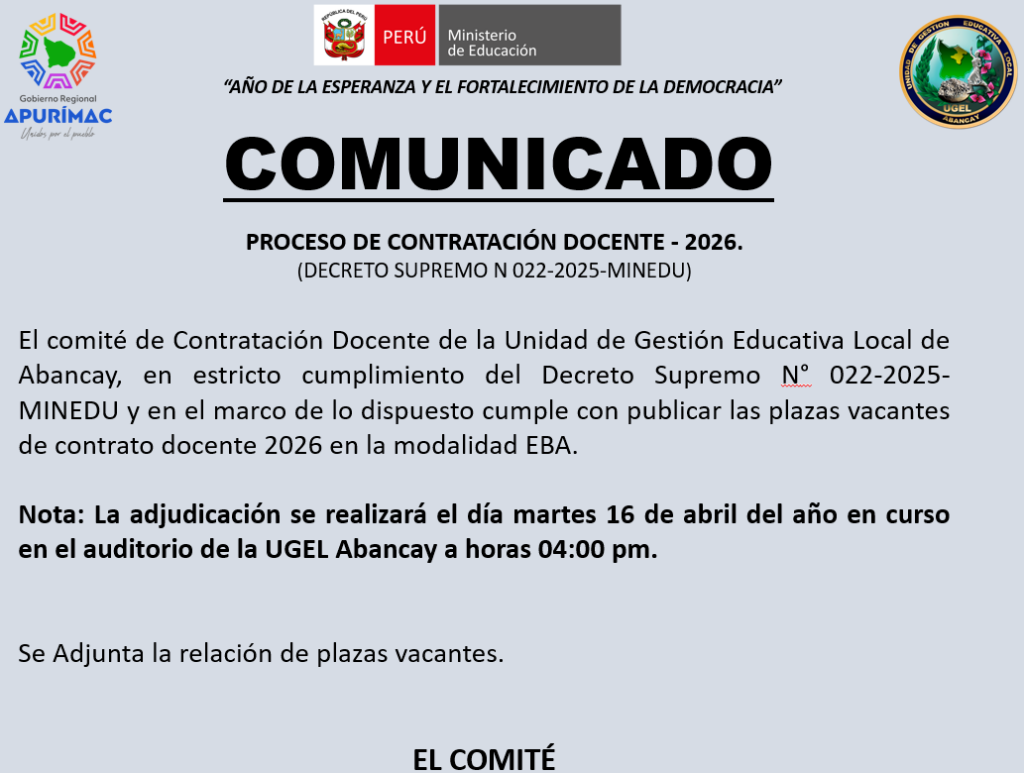 ADJUDICACION DE PLAZAS – CONTRATO DE DOCENTES – PRUEBA NACIONAL/EVALUACIÓN DE EXPEDIENTES